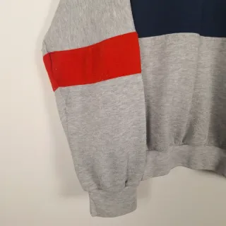 Rare vintage Adidas Originals sweatshirt in heather grey. Features a distinctive retro design with a navy blue horizontal stripe across the chest and red bands on the sleeves. Finished with an embroidered Adidas Sport Trefoil logo on the chest and a navy collar trim. Based on the white neck tag with silver lettering, this piece dates back to the 1980s. A perfect item for a blokecore or classic sportswear aesthetic. Condition: In good vintage condition. If there are any flaws, they are visible in the images. Measurements (Width x Length): 70 x 61 cm #Adidas #Vintage #Sweatshirt #80s #ColorBlock #Streetwear #Retro #Trefoil #Sportswear