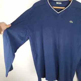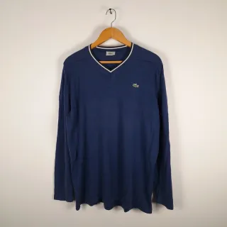 Classic vintage Lacoste V-neck sweater in a deep navy blue colorway. Features distinctive white piping/tipping on the ribbed neckline and the iconic green crocodile logo embroidered on the chest. This piece is a high-quality vintage item labeled "Made in Spain". A timeless essential perfect for an Old Money, preppy, or casual golf aesthetic. Condition: In good vintage condition. If there are any flaws, they are visible in the images. Size: Tag Size 7 (Corresponds to XXL, but fits smaller like a modern L/XL based on measurements) Measurements (Width x Length): 57 x 73 cm #Lacoste #Vintage #VNeck #NavyBlue #MadeInSpain #OldMoney #P