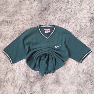 Rare vintage Nike short-sleeve top from the iconic 90s "Nike Premier" line. Presented in a dark forest green colorway with a distinct waffle/thermal knit texture. Features a classic V-neck design with retro striped detailing on the collar and sleeve cuffs, finished with a crisp white Nike Swoosh embroidered on the chest. An excellent, high-quality piece for a vintage sportswear or relaxed streetwear look. Condition: In good vintage condition. If there are any flaws, they are visible in the images. Size: XL #Nike #Vintage #90s #NikePremier #WaffleKnit #Streetwear #Retro #VNeck #Sportswear #Green