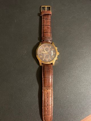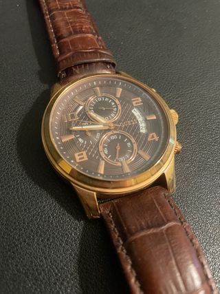 Elegante reloj Guess con correa de piel. - Esfera con detalles en tono cobre. - Diseño con múltiples subesferas. Buen estado general. Correa con marcas de uso habituales. Sin pila
