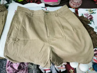 Pantalones cortos de tela en color beige. - Cintura con trabillas. - Cierre de botón y cremallera. - Bolsillos delanteros. - Bolsillos traseros.