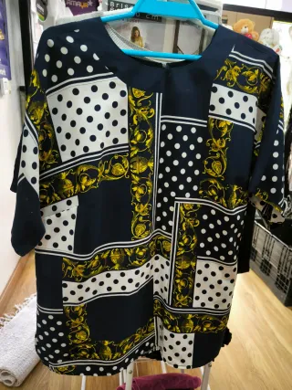 Elegante blusa con un llamativo estampado. - Diseño con motivos dorados y lunares blancos sobre fondo negro. - Corte holgado y mangas cortas. - Tejido ligero y fluido.