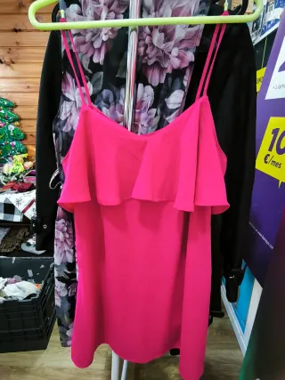Vestido corto de tirantes finos con un diseño de volantes en la parte delantera. La tela es ligera y con un acabado liso. - Tirantes finos ajustables. - Volantes decorativos en el pecho. - Diseño de corte recto.
