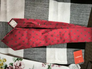 Elegante corbata de seda con un diseño de rombos en tonos rojos y detalles en blanco y azul. La etiqueta de la marca está visible. - Tejido: Seda - Diseño: Rombos - Color: Rojo