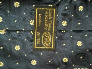Elegante corbata de la marca Frank Thake & Roskilly. - Diseño con estampado floral y ondas. - Combinación de colores azul y dorado. - Etiqueta con est. 1896 y logo.
