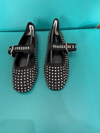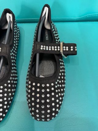 Elegantes bailarinas de terciopelo negro adornadas con cristales brillantes. - Diseño de bailarina. - Cierre de tira con hebilla. - Adorno de cristales por toda la superficie.