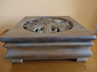 Elegante y robusta caja joyero de madera con un bonito diseño tallado en la tapa. - Material: Madera. - Color: Marrón. - Diseño: Tapa con relieve floral. - Base con patas.