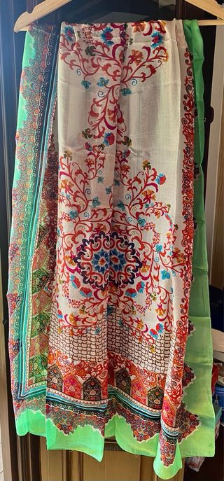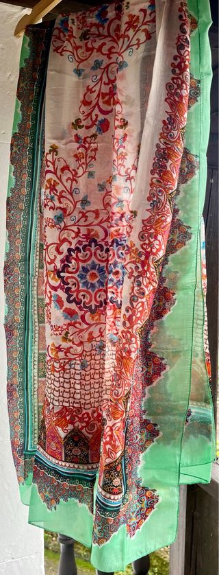 Elegante pañuelo de seda con un vibrante estampado. - Diseño floral y ornamental. - Bordes decorados con grecas. - Tacto suave y ligero.
