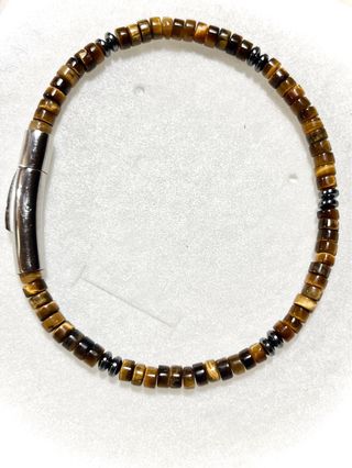 Pulsera con cuentas de ojo de tigre y detalles en hematita. Cierre de acero inoxidable. - Diseño unisex. - Cuentas de ojo de tigre. - Detalles en hematita. - Cierre de acero inoxidable.
