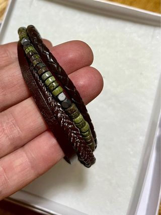 Pulsera unisex con un diseño moderno y materiales de calidad. - Elaborada en cuero trenzado. - Detalle de cuentas de unakita. - Cierre magnético para mayor comodidad.