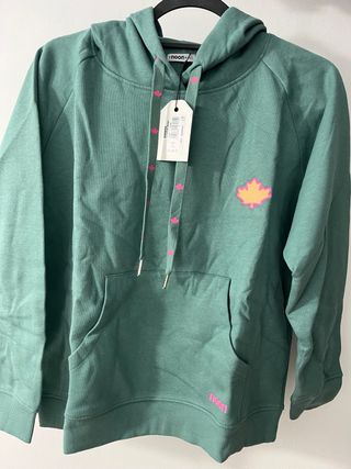Sudadera de la marca NOON en color verde. Presenta un diseño moderno con cordones decorados con pequeños detalles rosas y un parche de hoja en la parte delantera. - Cordones con estampado de hojas rosas. - Parche de hoja bordado.