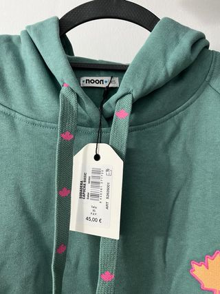 Sudadera con capucha y bolsillo frontal. - Detalle de hoja amarilla y rosa en el pecho. - Cordones con pequeños detalles rosas. - Logo de NOON en color rosa en la parte inferior.