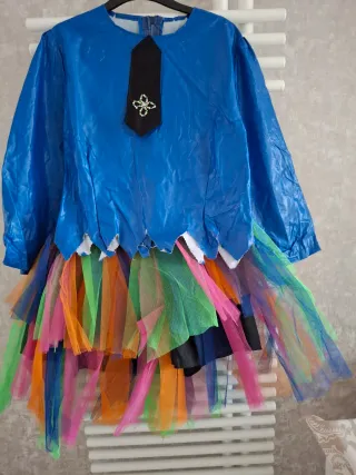 Conjunto de disfraz de bruja que incluye una capa y una falda de tul multicolor. - Capa negra. - Vestido azul con detalles. - Falda de tul con varios colores.
