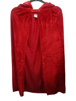 Capa de terciopelo rojo, ideal para disfraces. Con capucha y cierre de velcro en el cuello.