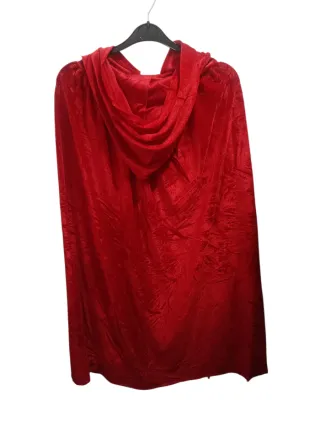 Capa con capucha de disfraz roja, ideal para completar un atuendo. - Acabado satinado. - Borde decorativo dorado. - Cierre con cordones en el cuello.