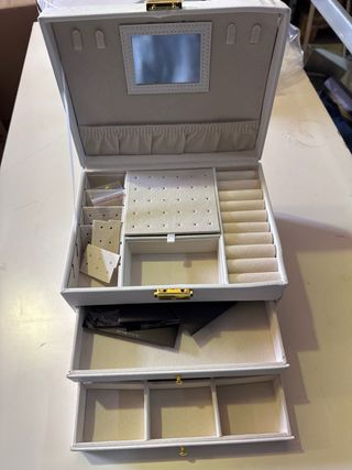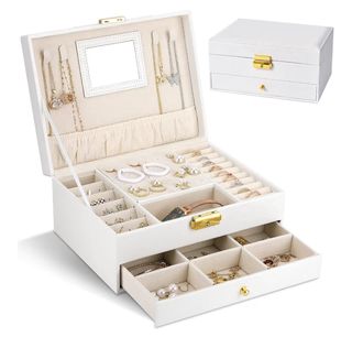 Elegante joyero de dos capas con espejo integrado y cajón extraíble para organizar tus accesorios. - Diseño de dos niveles para máxima capacidad. - Espejo cuadrado en la tapa superior. - Cajón con compartimentos. - Acabado blanco texturizado.