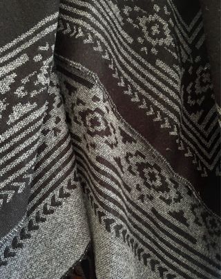 Capa tejida con un diseño geométrico y detalles de flecos en el bajo. Es una prenda versátil y cómoda.liquido por cambiar de armario - Diseño de rombos en blanco y gris. - Borde con estampado étnico. - Flecos en el dobladillo.
