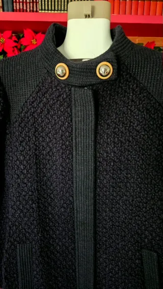 Espectacular prenda de abrigo de la firma de lujo española Pedro del Hierro. Es una pieza que combina la estructura de una chaqueta con el vuelo y la elegancia de una capa, confeccionada en lana virgen 100% de alta calidad. ✨ Detalles que la hacen única: Diseño: Corte evasé (tipo capa) que aporta mucho movimiento y sofisticación. Tejido: Lana con una textura "bouclé" o relieve muy elegante en color azul marino oscuro (casi negro). Cuello Mao: Cierre superior con dos botones joya dorados/plateados que le dan un toque de distinción. Acabados Premium: Detalles en punto acanalado en el cuello, la tapeta central y los bolsillos, dem