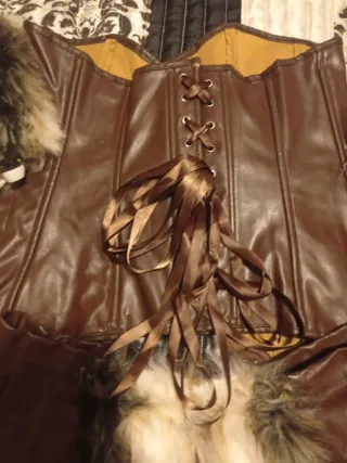 Conjunto de disfraz de tres piezas con detalles de pelo sintético. - Corset de cuero sintético marrón con cordones. - Falda corta con pliegues y adornos de pelo. - Capa o chaleco con pelo sintético.