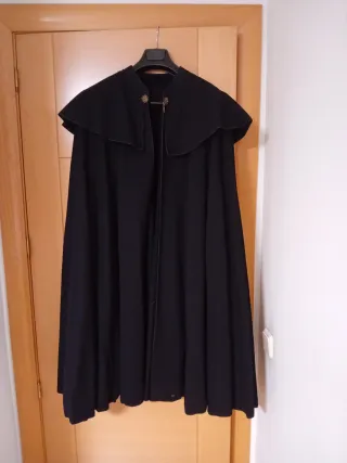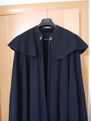Preciosa capa española de estilo clásico, inspirada en la moda de los años 50. Una prenda elegante y atemporal. - Diseño de capa larga. - Cierre frontal con detalles. - Cuello con solapa.