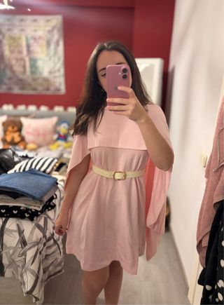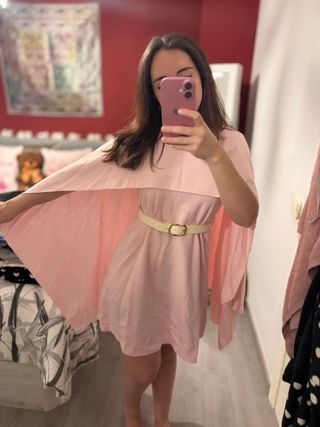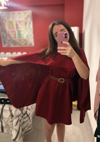 Vestido color burdeos con capa integrada. Incluye cinturón. Talla S (da bastante talla y con el cinturón te lo puedes ajustar a la cintura). Sin estrenar. Medidas: 92cm pecho, 98cm cintura, 86cm de largo