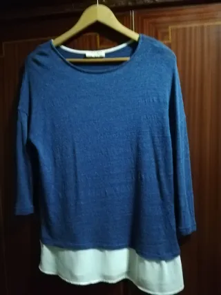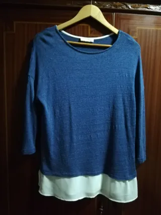 Jersey de manga larga para mujer con un diseño de doble capa. - Parte superior de punto azul. - Capa inferior de tela blanca.
