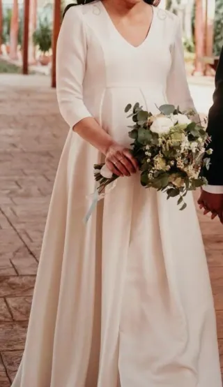 Elegante vestido de novia diseñado para futuras mamás. Su corte favorece la figura y permite comodidad. - Diseño de manga larga. - Escote en V. - Detalles bordados en los hombros.