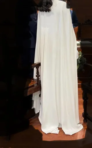 Elegante vestido largo de alta costura en color blanco, con un diseño sofisticado que incluye una capa. - Diseño de alta costura. - Incluye capa. - Largo hasta el suelo. Perfecto para bodas, comuniones,etc Nuevo con etiquetas Precio negociable