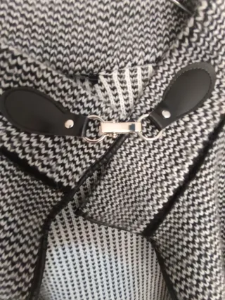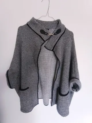 Chaqueta de punto con diseño tipo capa. Tiene algunas bolitas y ebras sacadas - Tejido texturizado en blanco y negro. - Ribete negro en los bordes. - Bolsillos frontales. - Cierre con broche decorativo.