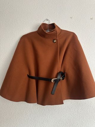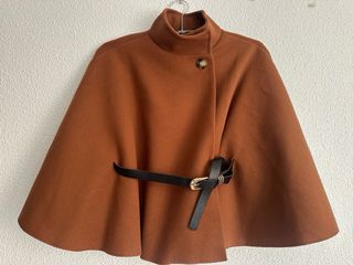 Elegante abrigo corto tipo capa con cinturón. - Diseño con cuello alto. - Cierre de botón. - Cinturón negro con hebilla dorada. - Equivale desde una XS a una M