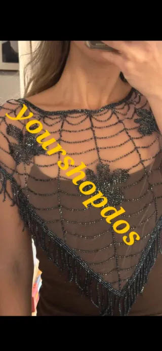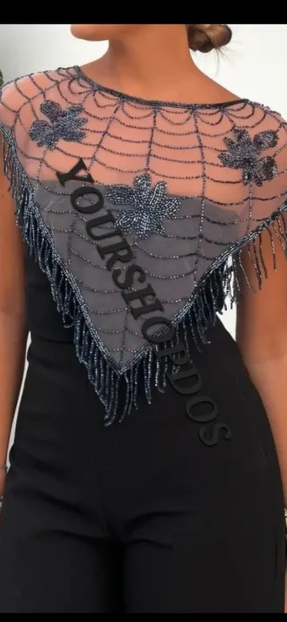 Elegante capa de Zara con un intrincado diseño de red y flores, adornada con abalorios. - Diseño de red con detalles florales. - Adornos de abalorios y flecos en el borde. - Transparente con base grisácea.