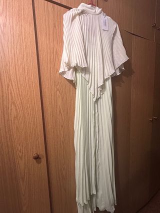 Elegante vestido de ceremonia con una capa incorporada. Su diseño plisado le da un toque sofisticado. tonos lima / amarillo pastel. La capa de quita. Costo 169€ - Diseño plisado. - Capa integrada.