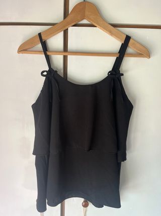 Top negro con tirantes ajustables mediante lazo. Un básico para noches de verano, combinado con un jean es top! En invierno lo puedes combinar con abrigo de pelo o un blazer, queda muy chic💖 - Diseño de dos capas. - Tirantes con detalle de lazo.