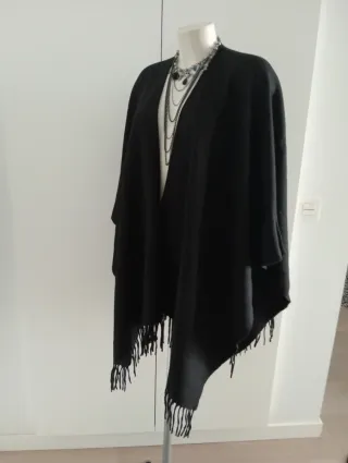 Elegante capa negra con un diseño moderno y detalles de flecos. - Capa con flecos en el bajo. - Diseño abierto. Capa negra con tejido tipo paño fino , terminación de flecos. Talla única, muy ligera y cómoda. Ideal para entretiempo o para llevar por encima de blazer o abrigo . No lleva etiqueta de ningún tipo. Muy poco uso, estado impecable.