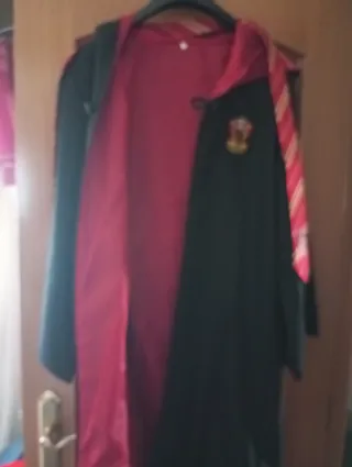Capa o túnica de Gryffindor, ideal para cualquier fan de Harry Potter. Se encuentra en muy buen estado e incluye corbata con el logo bordado. - Túnica larga con capucha. - Diseño elegante y detallado. - Incluye escudo de Gryffindor bordado.