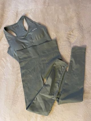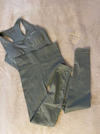Precioso set de deporte de la marca española Robin talla M, en tejido seamless suave y resistente color verde agua grisáceo (Green moss) que no transparenta nada. El top o sujetador deportivo de espalda nadadora tiene espuma que se puede quitar por los laterales y refuerzo en el bajo, por lo que se mantiene fijo y da soporte al pecho. Los leggins o mallas son de canalé de doble capa y sin costuras. Está como nuevo.