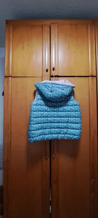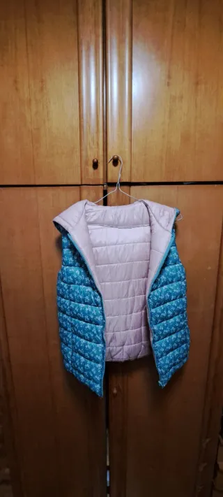 Chaleco reversible para niña, ideal para añadir una capa extra de abrigo con estilo. - Diseño estampado en tonos verde y rosa. - Capucha integrada para mayor protección. - Acolchado para confort.