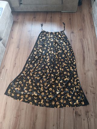 Falda larga de tela drapeada, mide 80 cms de largo. - Diseño de capas. - Cintura elástica. - Bajo con volantes.