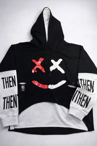 Sudadera con capucha de estilo streetwear. Presenta un diseño llamativo en la parte frontal. - Mangas con estampado THEN. - Capucha con cordones. - Doble capa inferior.