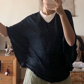 Poncho de estilo moderno con un diseño abierto y detalles deshilachados en los bordes. - Tejido ligero y vaporoso. - Corte amplio y cómodo. - Acabado con flecos en mangas y bajo.
