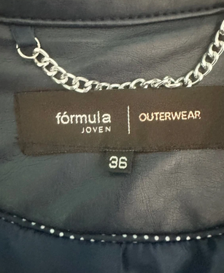 Cazadora de estilo motero en color azul. - Cierre de cremallera frontal. - Bolsillos con cremallera. - Cuello redondo con botón. - Puños con cremallera. En excelente estado. Sin manchas. Color azul oscuro