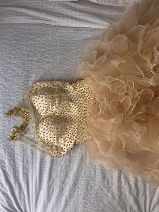 Elegante vestido estilo princesa en tono champán, adornado con pedrería dorada. El vestido está nuevo, solo fue usado una vez y está en perfecto estado. Una buena opción para un baile o para quinceañera Negociable Hecho a medida, tiene un corset que se ajusta en la parte de atrás. Viene con su can can - Cuerpo del vestido con escote ilusión. - Cuerpo del vestido cubierto de cuentas y pedrería dorada. - Falda voluminosa con múltiples capas de volantes. - Cierre de corset en la espalda. - Can can o enaguas blancas