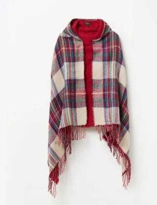 Poncho con un diseño clásico de cuadros escoceses (tartán) en tonos crema, granate, verde y toques amarillos. es una prenda muy versátil, ideal para el otoño e invierno, perfecta para llevar sobre jerséis o chaquetas de cuero. detalles del producto: diseño: estampado de cuadros por un lado y color granate liso por el interior. extras: incluye capucha amplia y detalle de flecos en el bajo que le dan un aire boho-chic. composición: 100% acrílico (tejido suave, cálido y no pica). estado: en muy buen estado, muy poco uso.