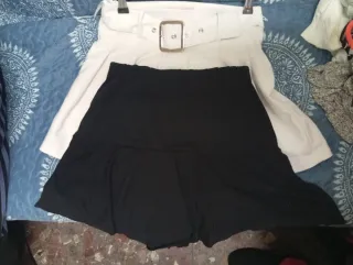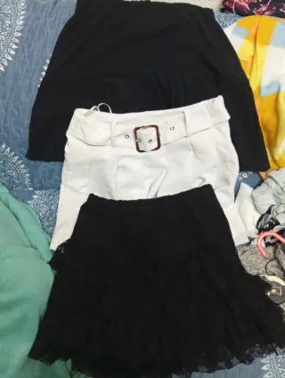 Conjunto de tres faldas cortas con volantes. - Dos faldas negras. Una de ellas con capas de tul - Una falda blanca con cinturón. - Tallas S y M. Precio todas
