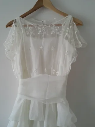 Elegante vestido de novia de estilo vintage. Presenta un diseño delicado con detalles de encaje y una falda con volantes. - Cuerpo de encaje con motivos florales. - Cinturón de tela a juego. - Falda con varias capas de volantes. Vestido tiene 43 años y está perfecto hecho por modista en las costuras se puede sacar, Vestido asimétrico.