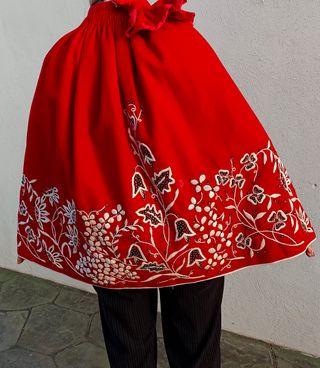 Falda larga con un bonito estampado floral en tonos verdes y azules. Presenta un diseño con varias capas y un borde inferior en color verde oscuro con un delicado bordado de flores. - Estampado floral. - Diseño en capas. - Borde inferior bordado.