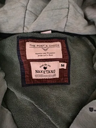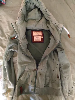 Chaqueta Naketano con capucha cordada, talla M, el color es verde estilo militar washed, los patrones de dibujo simulan salpicaduras de pintura, tiene una mancha en la manga derecha en la parte trasera, se ha diluido con algún lavado, si puedes vivir con ello, el precio no será problema. Tal cual la ves. Muy guapa.