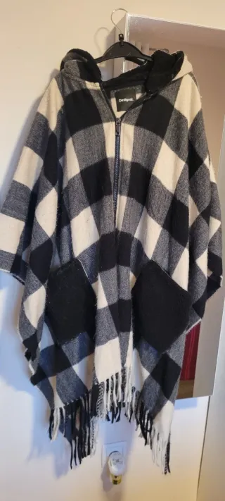 Chaqueta tipo poncho con un diseño de rayas finas, detalles brillantes y capucha. Es una prenda cómoda y versátil. - Tejido de lana suave. - Flecos en el bajo. - Diseño de rayas finas. Usada una sola vez.