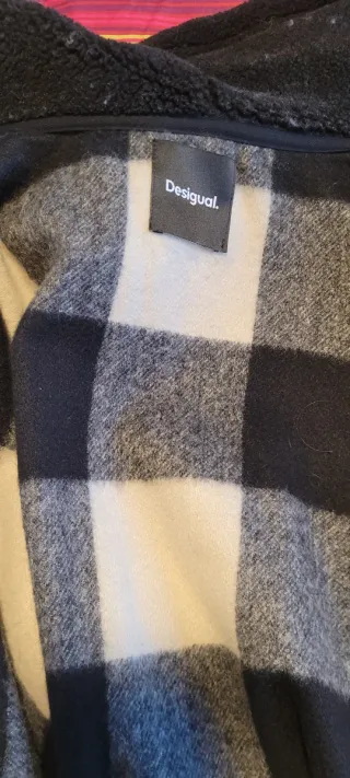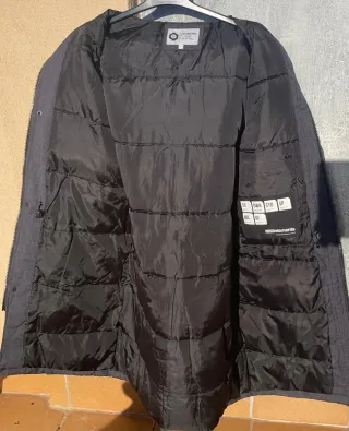 Chaqueton negro mate con capucha gordo y relleno. Hipercalido por su composición y constitución, polycotton (65% poliéster y 35% algodón) y triple forro de poliamida y poliéster además de refuerzos en la capa exterior. 8 bolsillos y capucha desmontable. Tiene un pequeño desgarro en el bolsillo (mira la foto) pero creo que a los jabalíes o a los ciervos no les va a molestar. Pone talla XL pero es mas bien XXL.