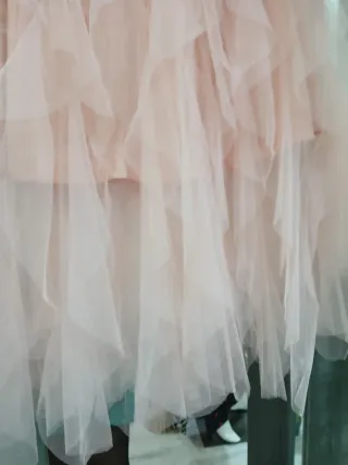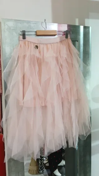 Elegante falda midi de tul en tono rosa palo, tiene una faldas mini, que nos permite lucir piernas, Su diseño actual con tiras de tul, asimetrica le da un toque especial. Ideal para sport, con botas, botines o deportivos, acompañada con una cazadora vaqueta.. Para vestir, con un corpiño.. Talla S y M Moda Española - Tejido de tul. - Diseño con múltiples capas y volantes.